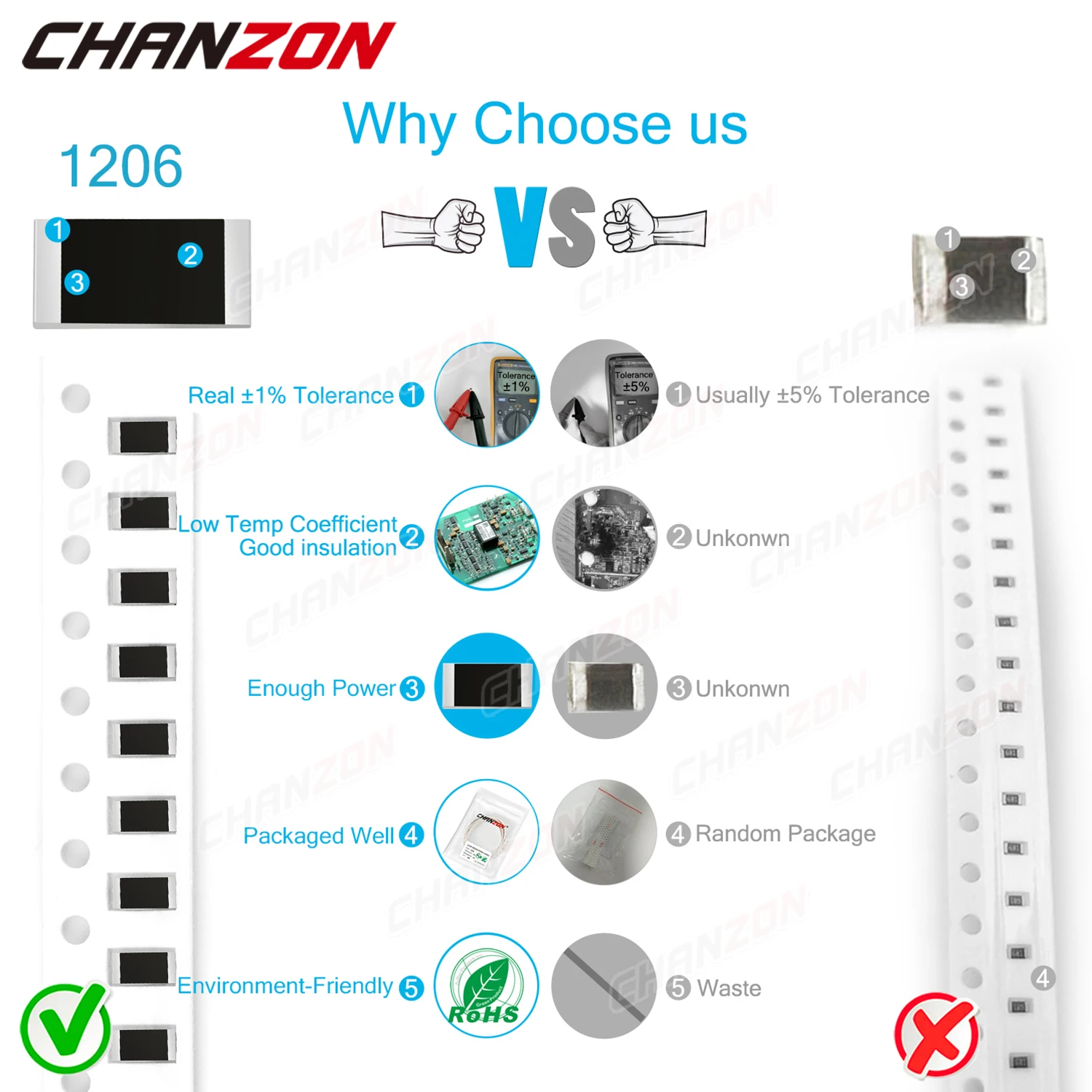 100 Pcs SMD 1206 Resistor 0ohm - 10M Ohm 1/4W 1% High Precision Film Chip Fixed Resistance
