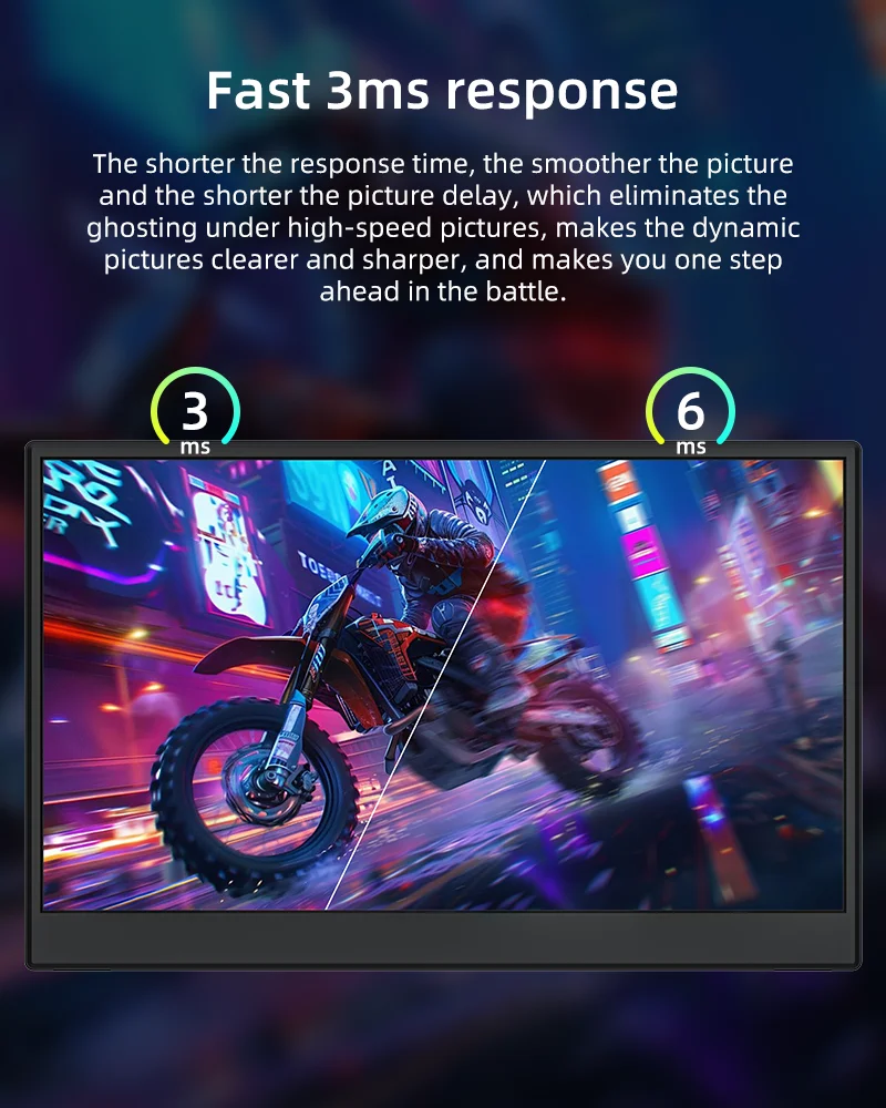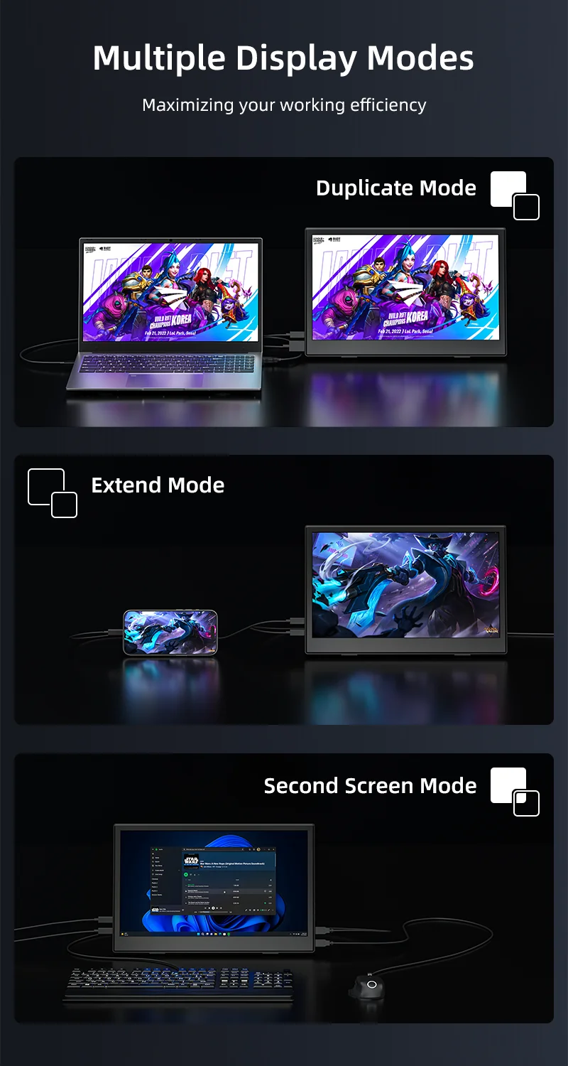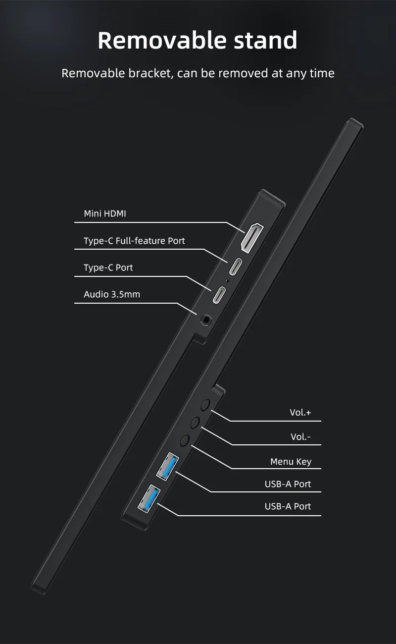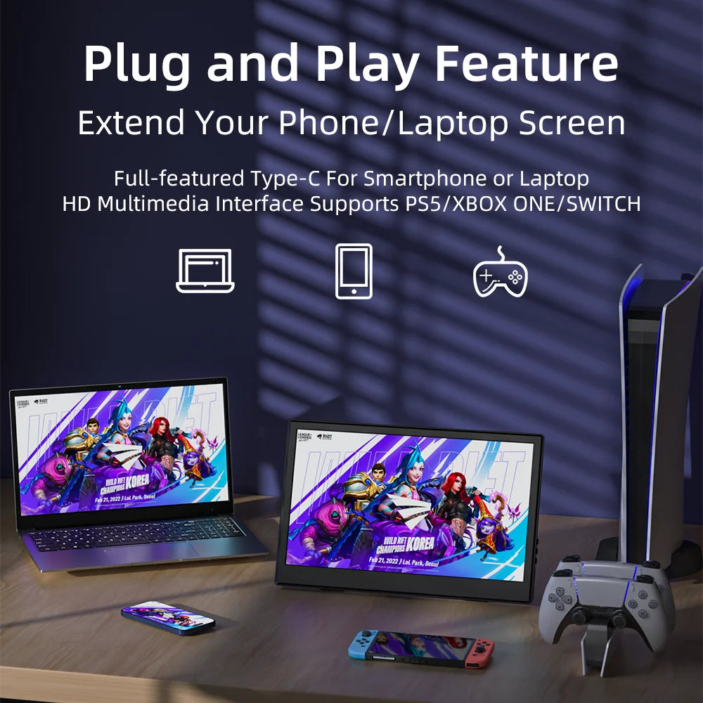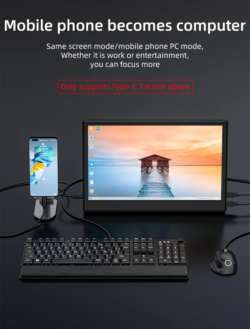 This 11.6-inch portable monitor is not only extremely convenient, but also has excellent versatility. It is equipped with dual USB ports and supports external keyboards, mice and other peripherals, which facilitates a more efficient office experience. By connecting a mobile phone, you can transform the mobile phone screen into a PC operation mode, easily multitask and improve work efficiency. It is especially suitable for users who need to work outside or often need to switch between different places.