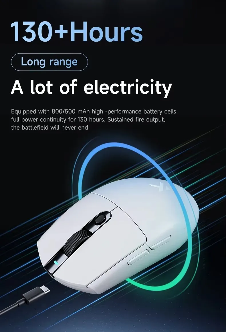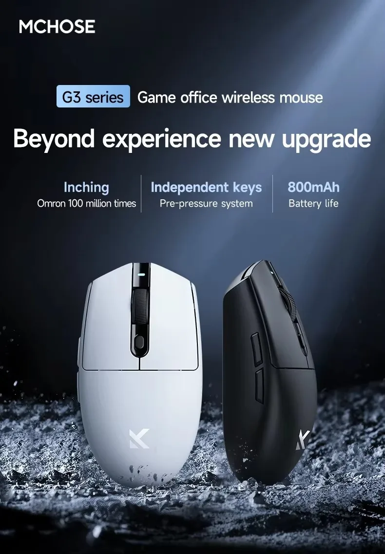 The MCHOSE G3 Wireless Gaming Mouse features advanced technology and ergonomic design for gamers and professionals. Its tri-mode connectivity (Wired, Bluetooth, 2.4G Wireless) allows seamless switching between devices. The PAW3311 sensor ensures precise, high-DPI tracking, ideal for fast-paced gaming or detailed work tasks. At only 64g, the lightweight design enhances control for extended sessions. With up to 130 hours of battery life, you can focus on your game without worrying about charging.
