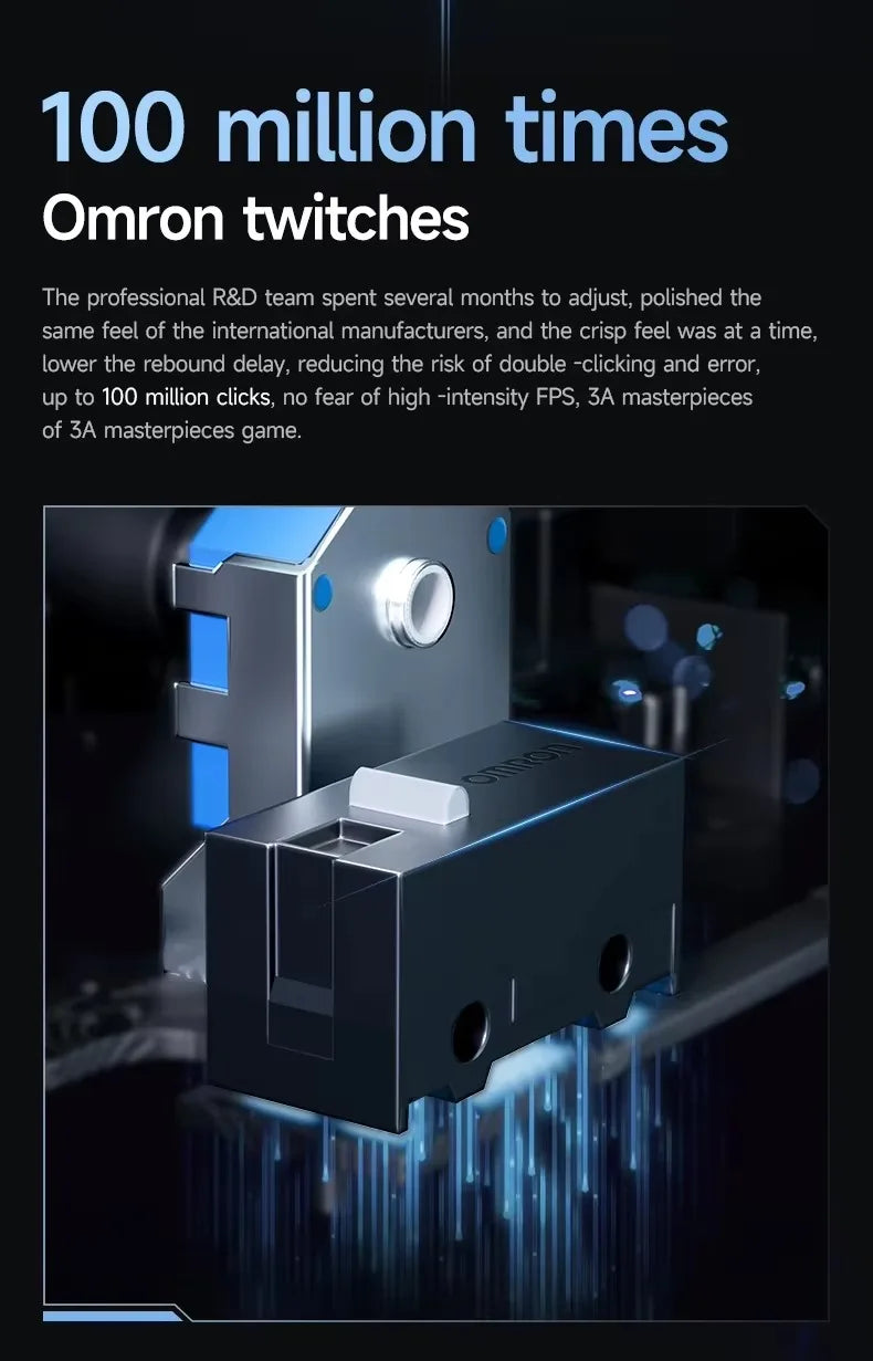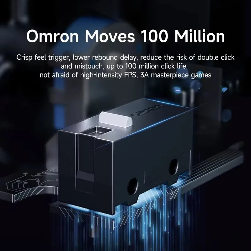 Durable Omron/Huannuo Switches: Omron switches rated for 100 million clicks (G3 A White/Black), Huannuo switches rated for 30 million clicks (G3 A White).