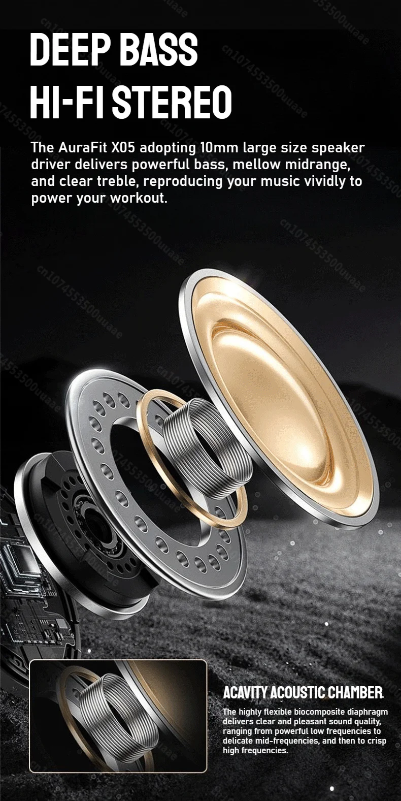 [ Hi-Fi Deep Bass Stereo ] The AuraFit X05 adopting 10mm large size speaker driver delivers powerful bass, mellow midrange, and clear treble, reproducing your music vividly to power your workout.