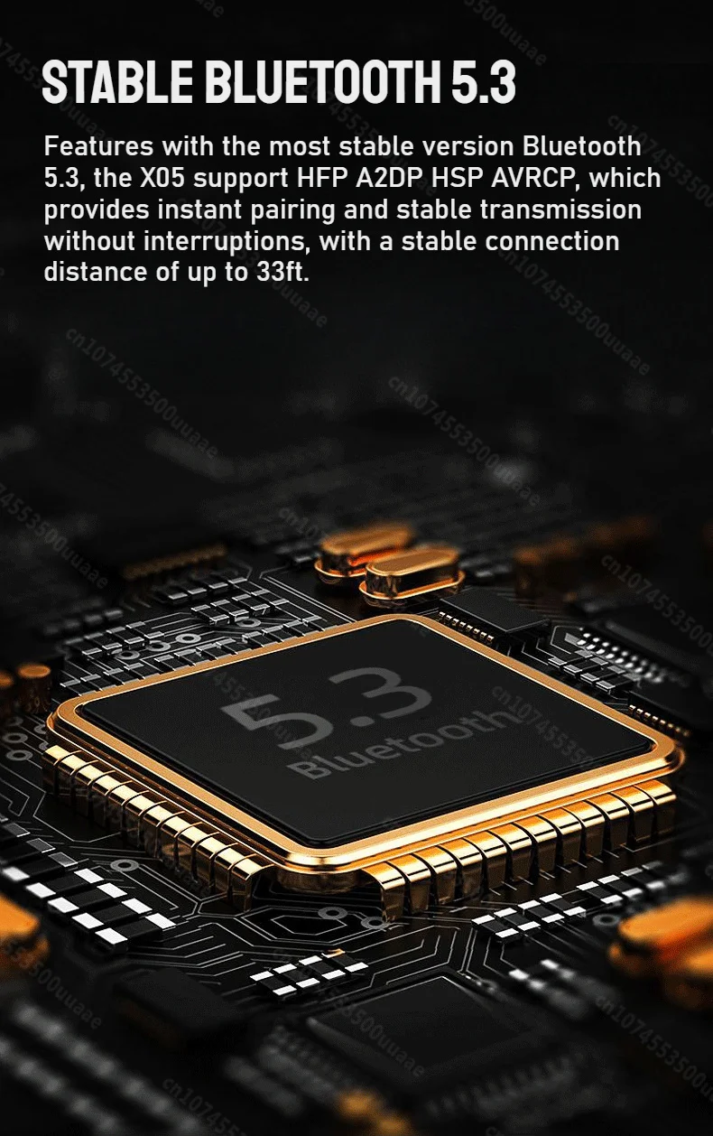 [ Bluetooth 5.3 ] Features with the most stable version Bluetooth 5.3, the AuraFit X05 support HFP A2DP HSP AVRCP, which provides instant pairing and stable transmission without interruptions, with a stable connection distance of up to 33ft.