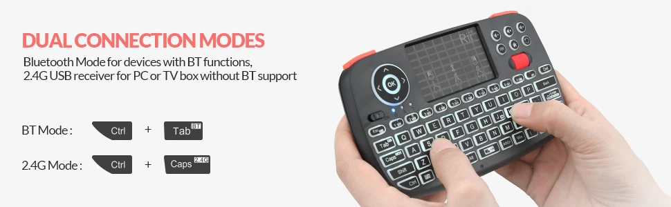 This mini wireless keyboard has BT and 2.4G dual modes. It can be used for e-mails, remote control, message input and games. It is compatible with PC, laptop, for Mac OS, Linux, Android TV box, and Windows system. Convenient to use, you can use it on the sofa to browse the Internet.